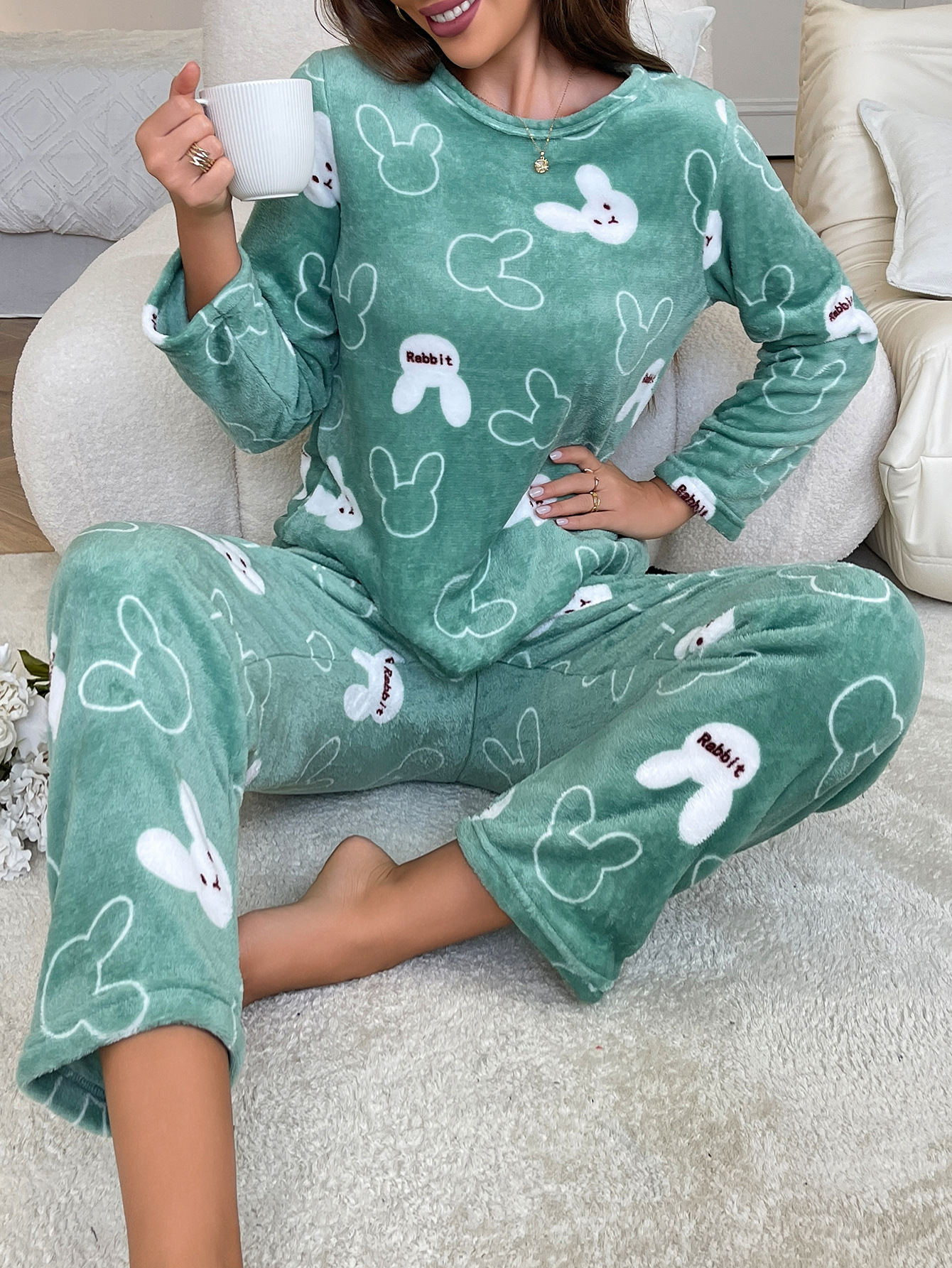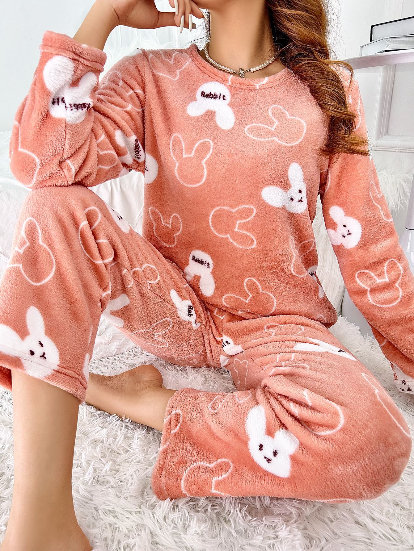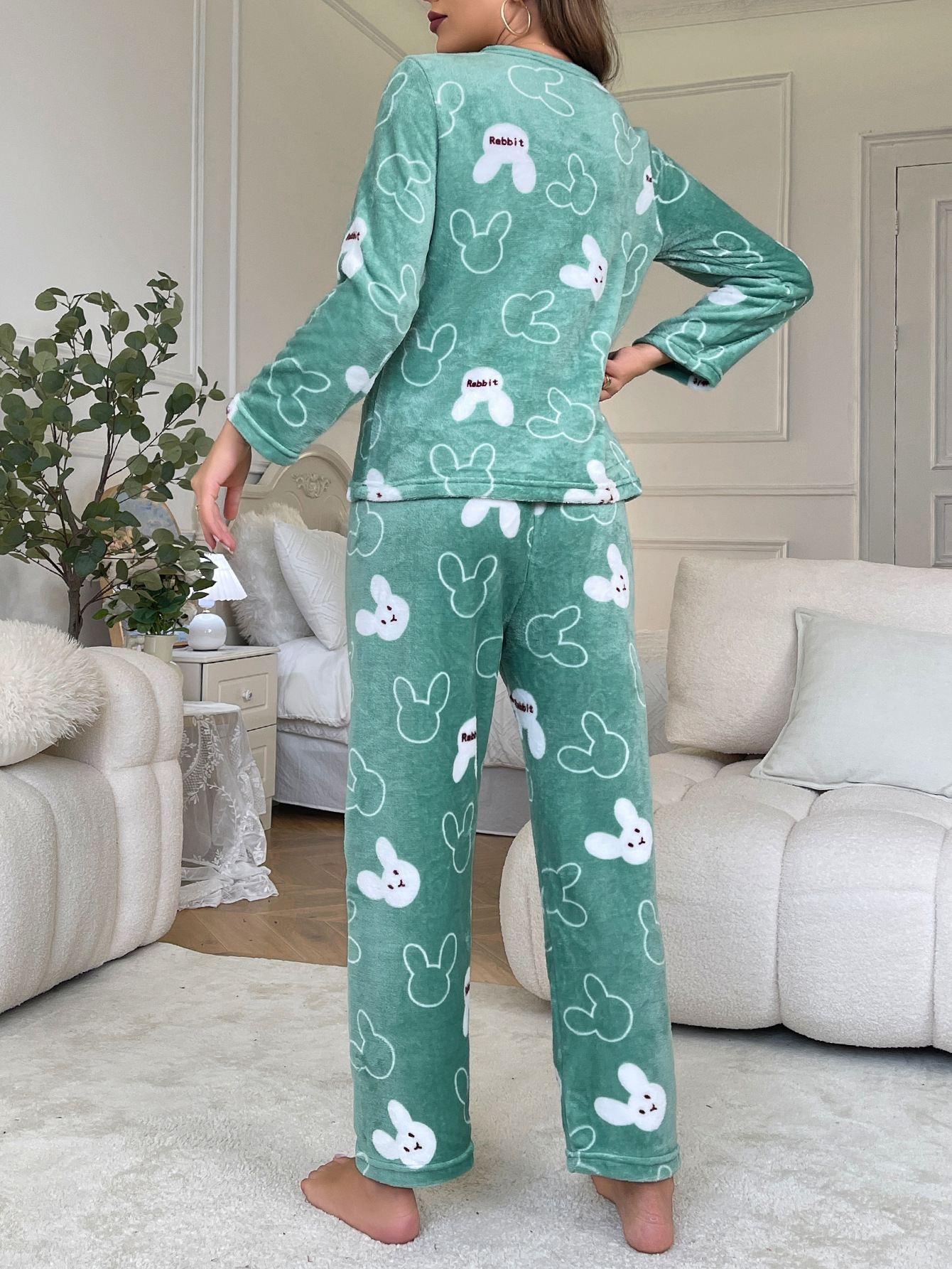 Flannel Cartoon Rabbit-Print Long-Sleeve Pajama Set With Long Pants