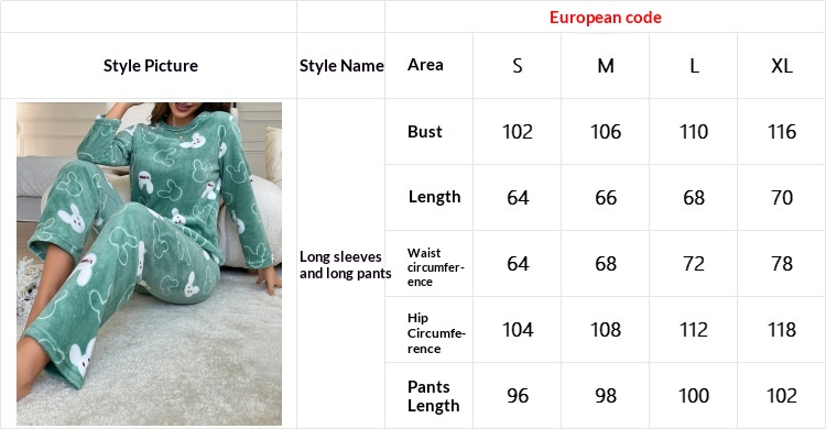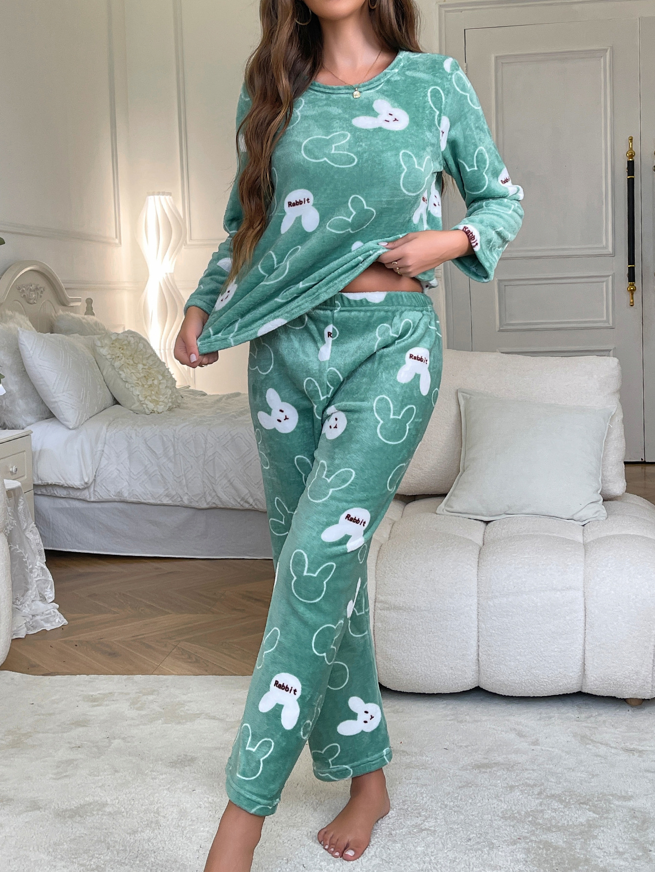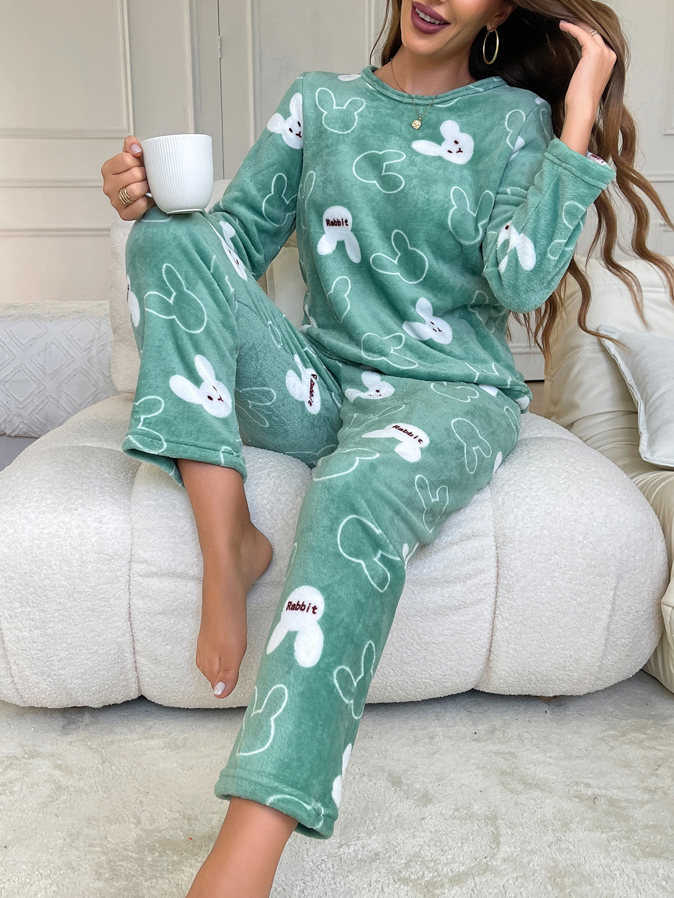Flannel Cartoon Rabbit-Print Long-Sleeve Pajama Set With Long Pants
